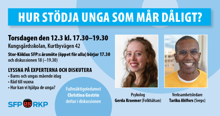 Hur stödja unga som mår dåligt? – diskussion torsdag 12.3 kl.18:00 i Kungsgårdsskolan. Ungas psykiska hälsa är en viktig samhällsfråga. Under diskussionen samlar vi olika perspektiv i en diskussion om…