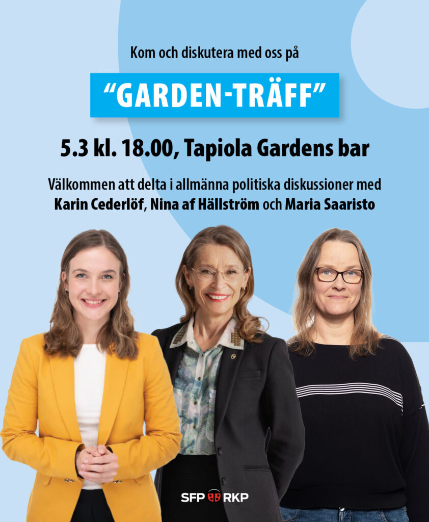Yleisiä poliittisia keskusteluja Tapiola Gardens´in baarissa, alustajan ja moderaattorin johdolla. Tule mukaan keskustelemaan ajankohtaisista poliittisista kysymyksistä yhdessä päättäjien, asiantuntijoiden ja poliittisesti aktiivisten kanssa. (Jokainen vastaa omista kuluistaan.) Keskustelut käydään ensisijaisesti ruotsiksi, mutta kysymyksiä saa ehdottomasti esittää myös suomeksi.