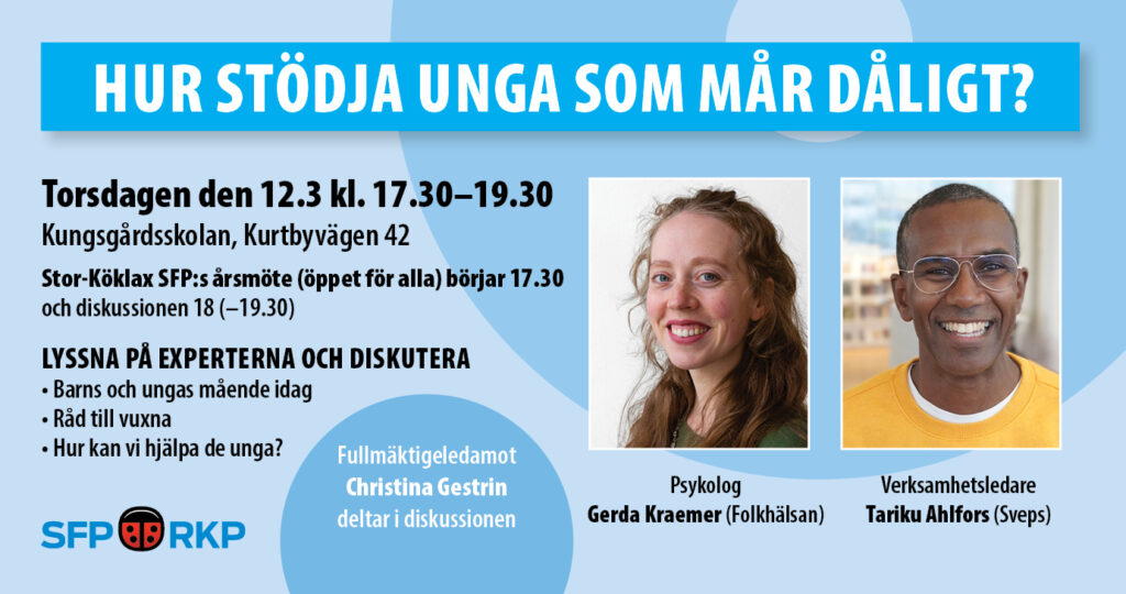 Hur stödja unga som mår dåligt? – diskussion torsdag 12.3 kl.18:00 i Kungsgårdsskolan. Ungas psykiska hälsa är en viktig samhällsfråga. Under diskussionen samlar vi olika perspektiv i en diskussion om hur vi kan identifiera behov, stärka stödinsatser och bättre möta unga som mår dåligt. (Diskussionen ordnas av SFP i Stor-Köklax efter lokalavdelninges årsmöte.)